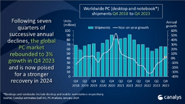 Looking back, PC sales surged during the peak of COVID restrictions in 2020 and 2021.[1] They saw a significant decline by 13.7% in 2022 and the first half of 2023 as restrictions eased, according to International Data Corporation data from August 2023.