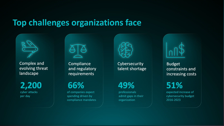 Mr. Rodewald detailed several challenges that organizations face these days, such as a complex landscape with thousands of attacks each day, with increased business spending driven by compliance requirements as well as demanding salaries for professionals (who are in shortage).