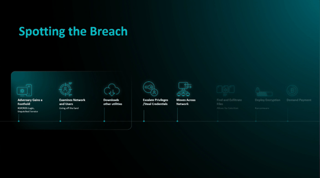 How long can it take for a breach to turn into ransomware/extortionware? Mr. Rodewald has seen that it takes as little as 48 hours. This is because if no one is monitoring detected threats or EDR alerts, a breach will continue to progress toward ransomware/extortionware. And while the EDR and/or endpoint protection will slow the breach down by blocking some detections, the adversary will just adjust and find a way to circumvent this (change of tactics/tools, work toward disabling endpoint security, or move laterally to an unprotected device).