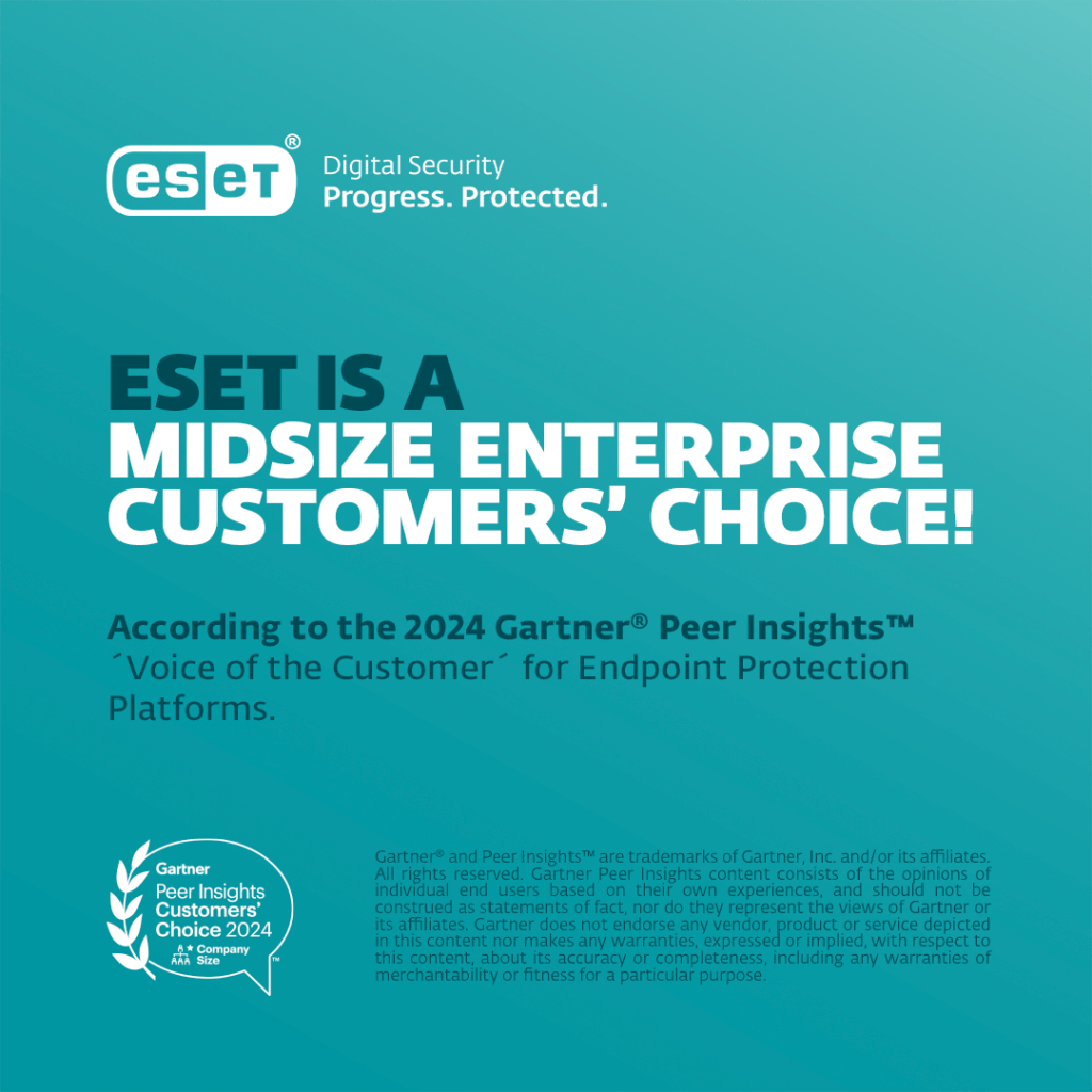 ESET, a global leader in cybersecurity solutions, has been named a Customers’ Choice for Midsize Enterprises in the 2024 Gartner® Peer Insights™ ´Voice of the Customer´ for Endpoint Protection Platforms.